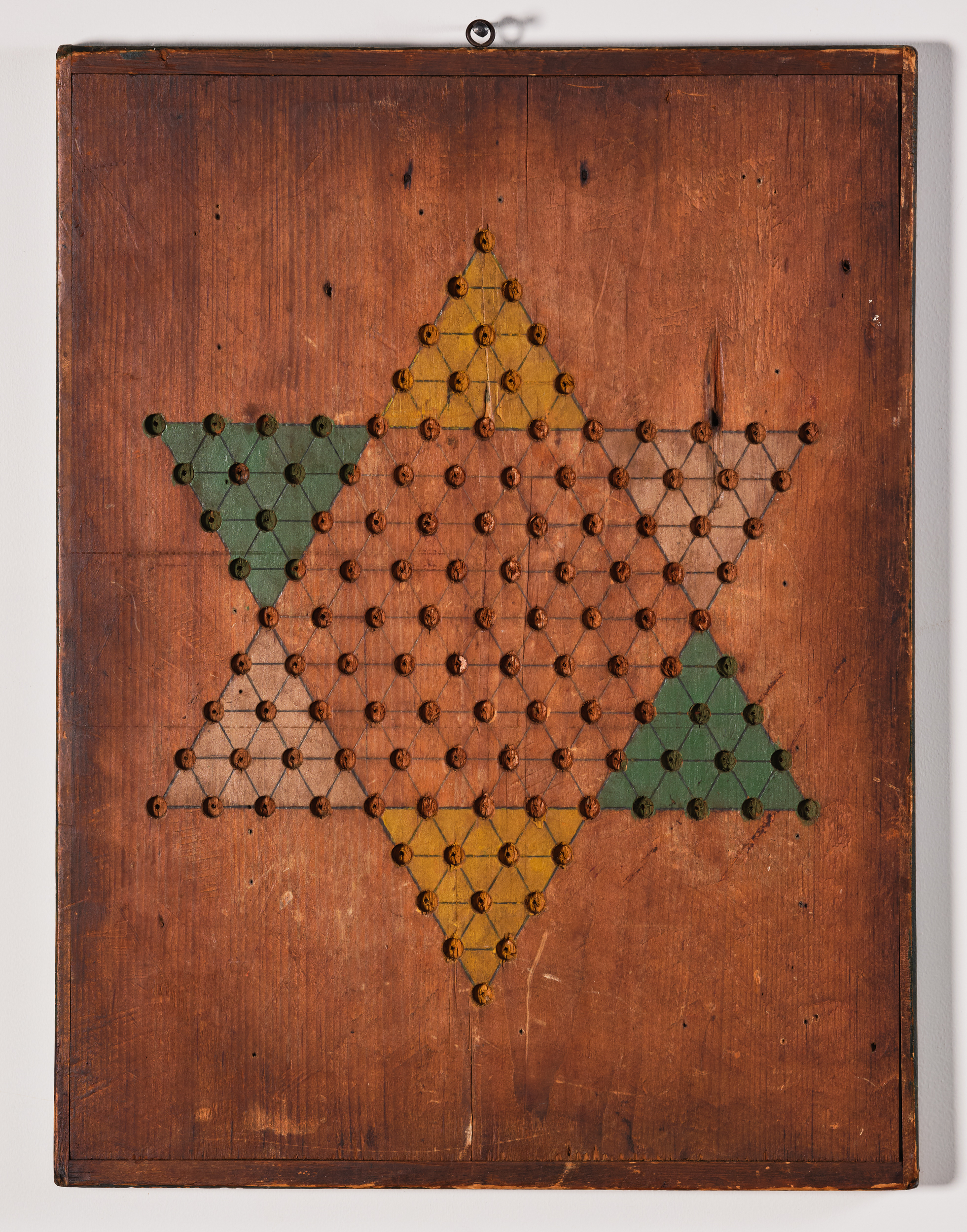 Pine with one side a checkerboard retaining the original blue squares outlined by a pastry crimper on a red ground; the reverse side is Chinese checkers
