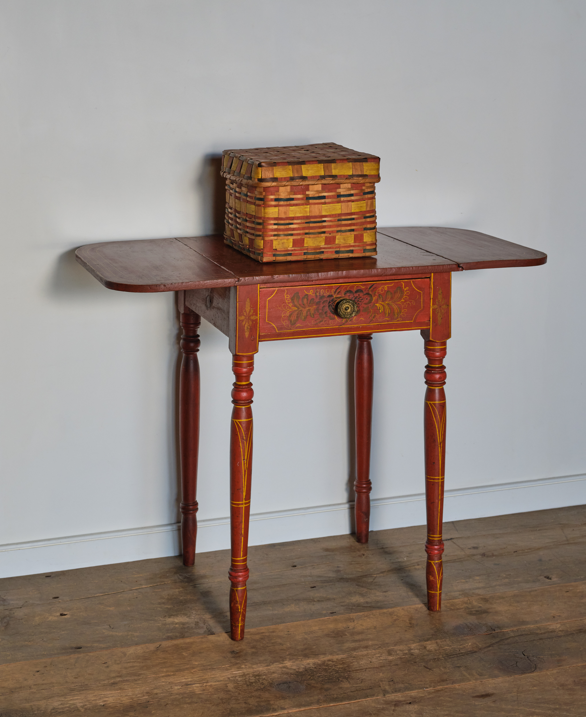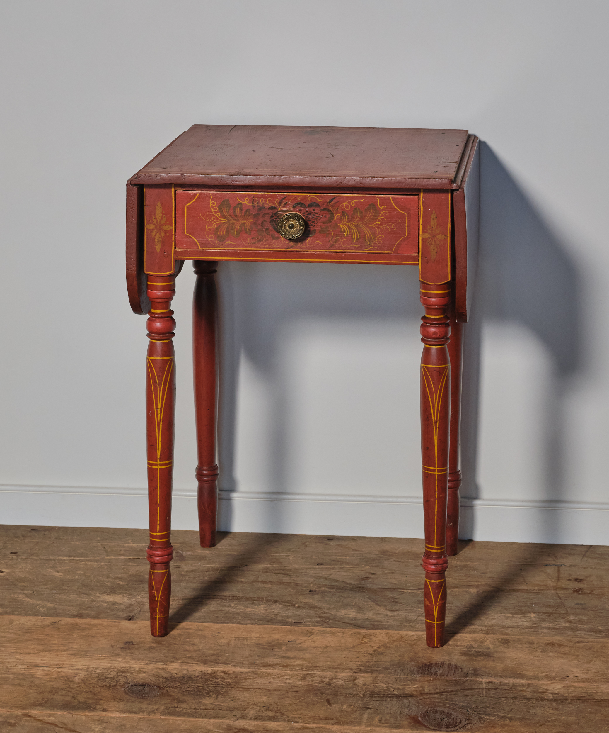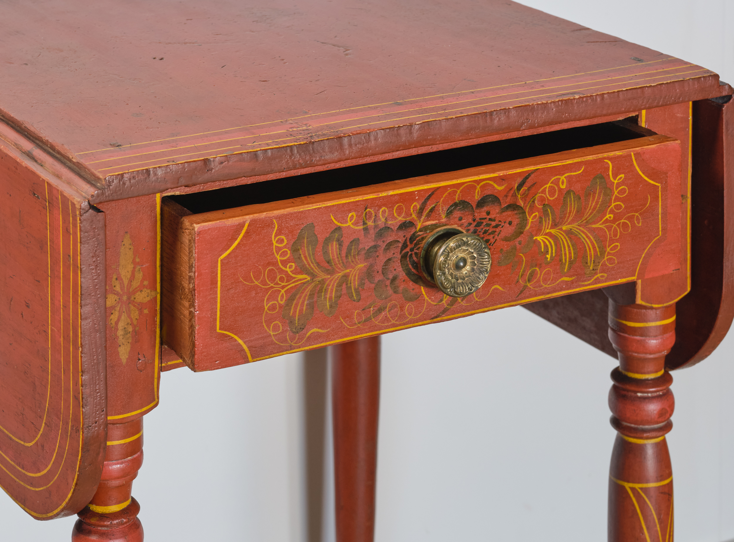 Pine, maple, and chestnut retaining original red-painted finish, the drawer with stenciled and fanciful decoration; the turned legs and top with yellow pinstriping. Original brass knob.
